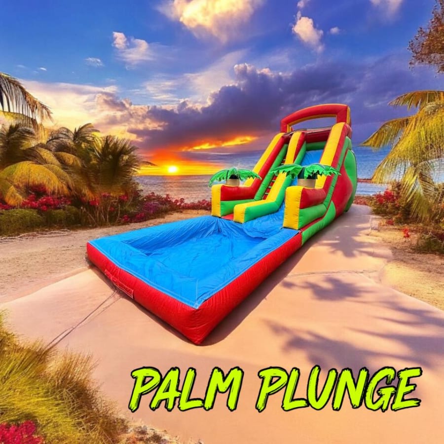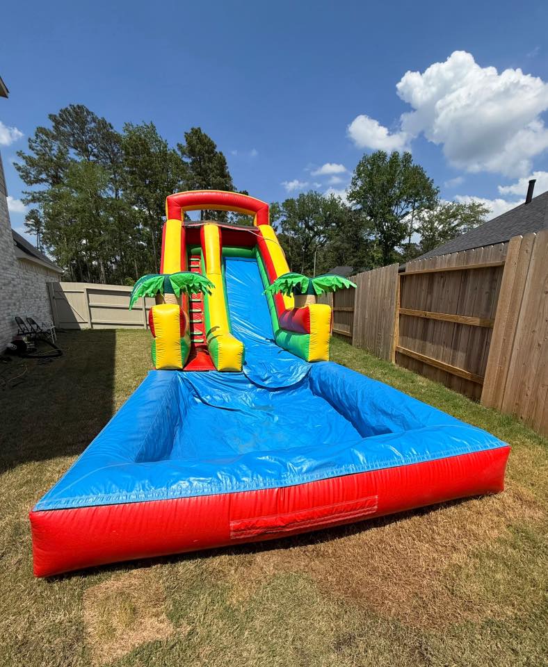 This vibrant tropical-themed inflatable water slide with pool is perfect for backyard parties and endless fun! Featuring a tall, colorful slide with palm tree accents and a large splash pool at the bottom, it’s ideal for cooling off on hot days. Safe, sturdy, and sure to keep kids entertained for hours!