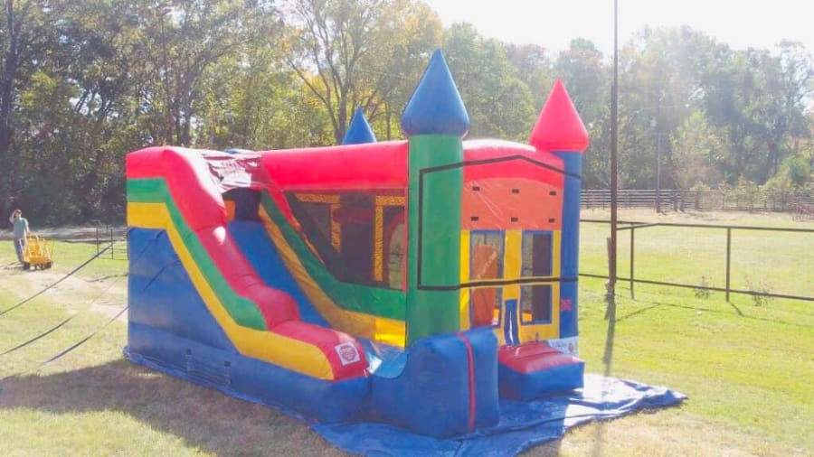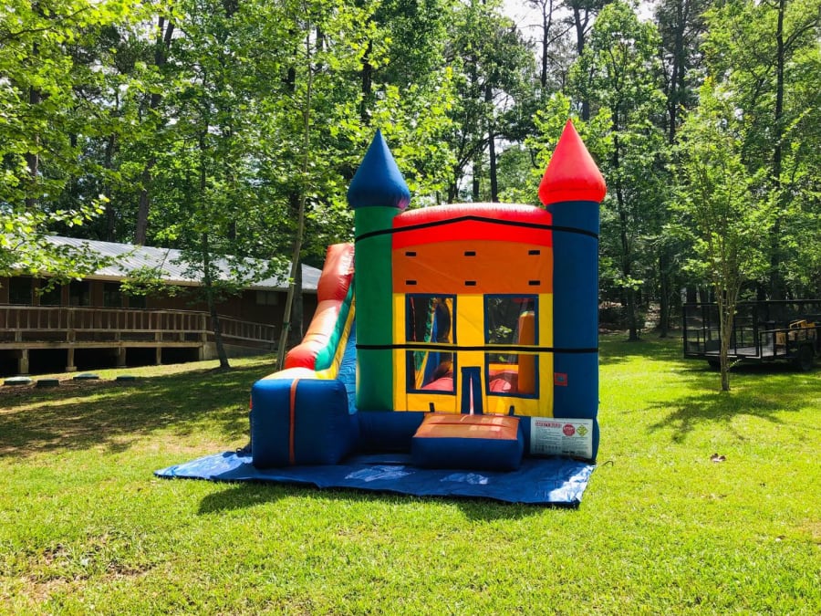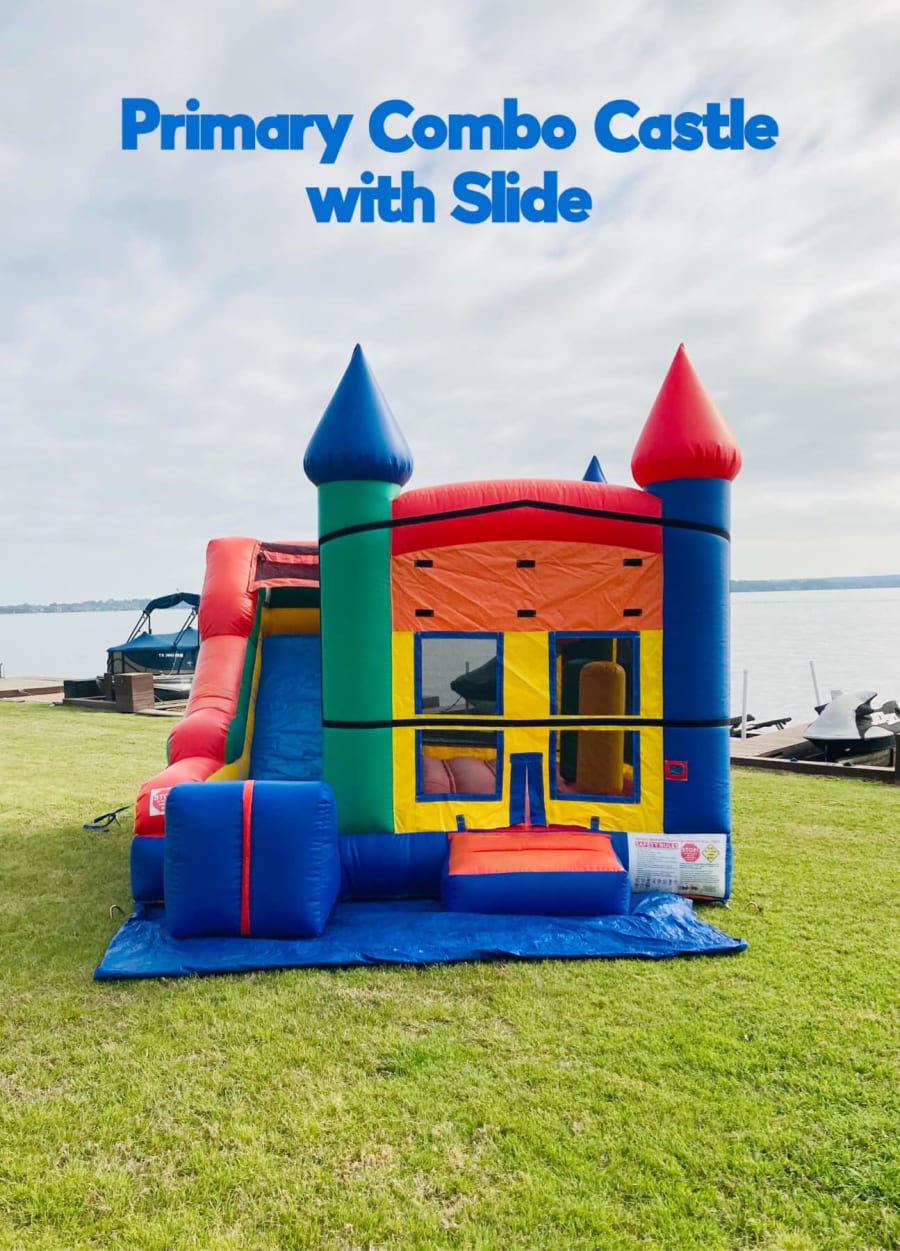 Our Primary Combo Castle w/ Slide includes a jumping area, basketball hoop, rock climbing steps, obstacle pop ups, and a slide that can be used wet or dry! We deliver to Magnolia, The Woodlands, Tomball, Conroe, and many other areas!